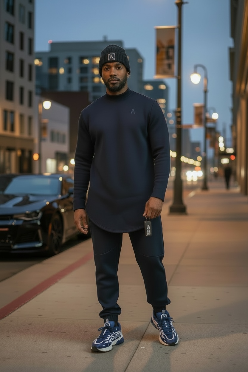 Crafted from luxurious cotton fabric, this set offers a soft yet substantial feel—breathable, structured, and built for daily wear throughout Ramadan and beyond. Textured vegan leather trim pockets on both the top and joggers introduce a subtle contrast, adding depth and distinction without excess.